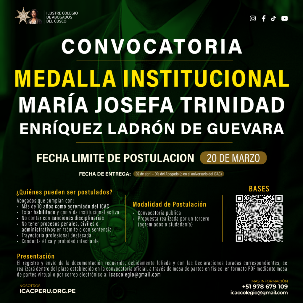 Convocatoria Medalla Institucional «María Trinidad Enríquez Ladrón de Guevara» Con motivo de la conmemoración del Día del Abogado este 2 de abril, y en estricta