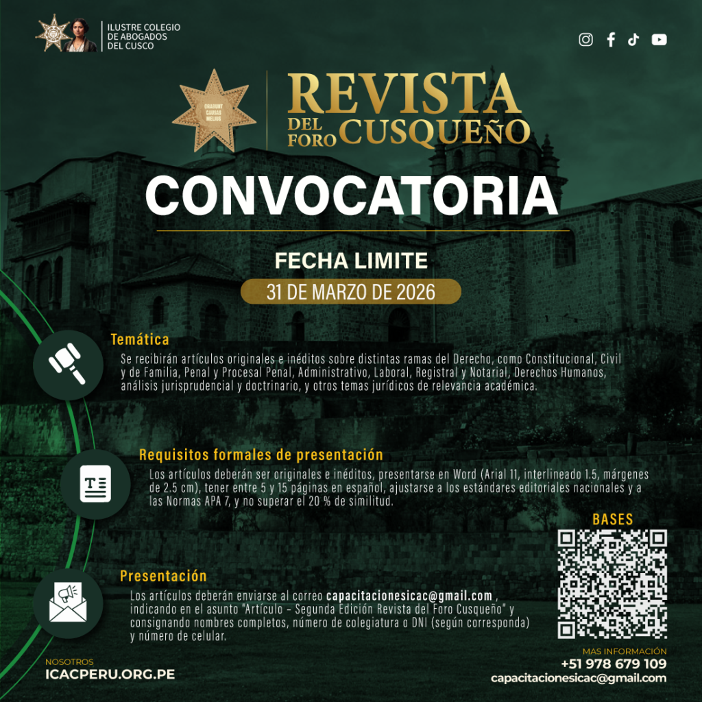 Publicación de Artículos en la Revista «El Foro Cusqueño» El Colegio de Abogados del Cusco, en cumplimiento de su función de promoción académica y fortalecimiento